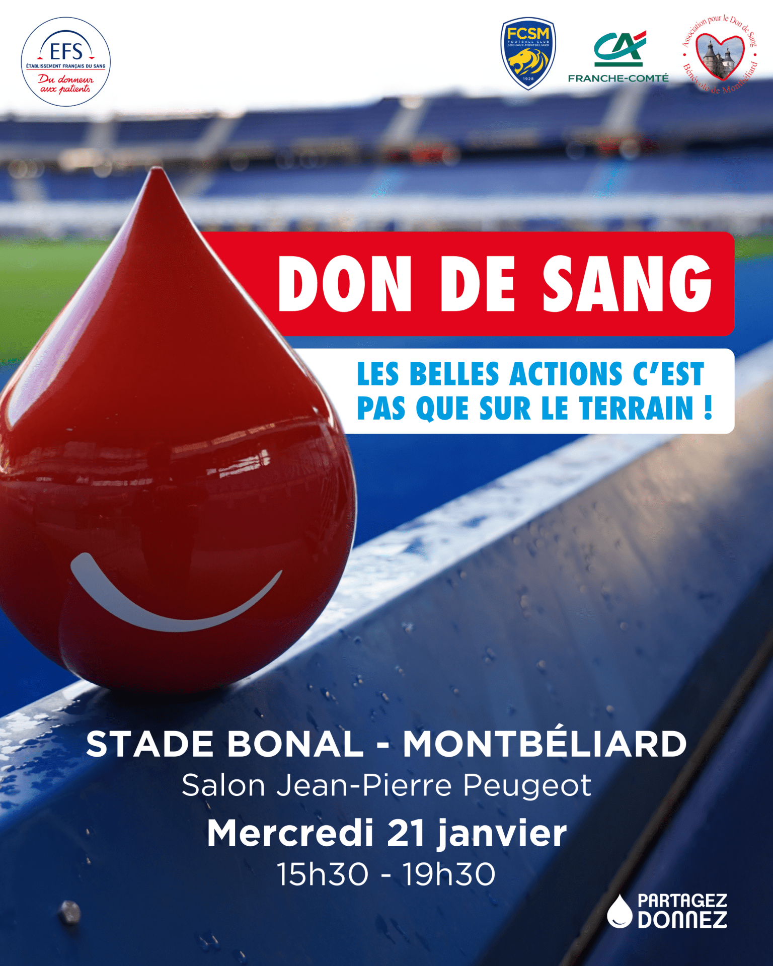 Les belles actions c'est pas que sur le terrain ! Le mercredi 21 janvier 2026, de 15h30 à 19h30, le FC Sochaux-Montbéliard, le Crédit Agricole Franche-Comté et l’Association des Donneurs de Sang Bénévoles de Montbéliard forment une équipe solidaire pour organiser une collecte au Stade Bonal.