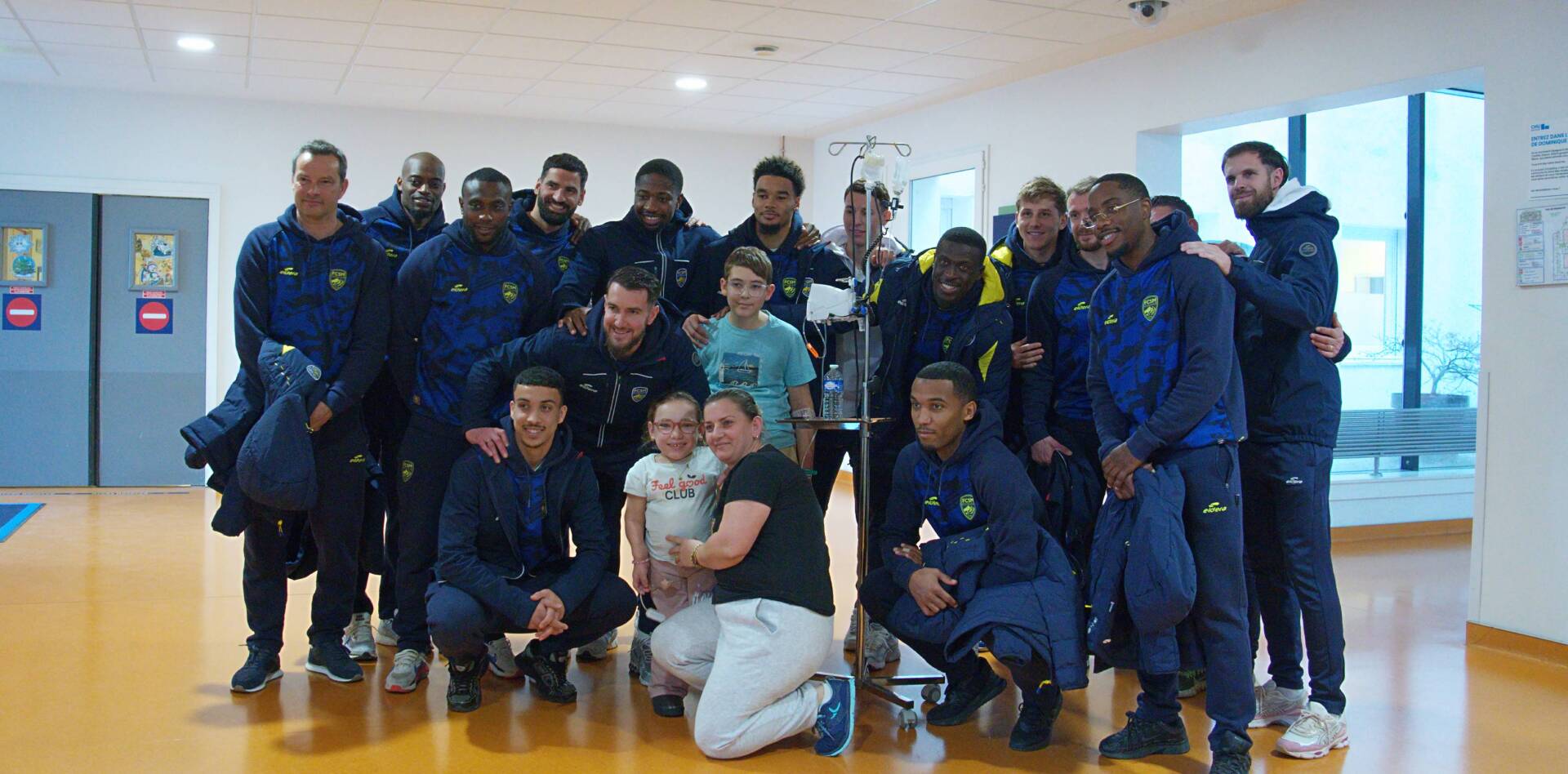 Le groupe a ensuite été scindé en deux : une partie des joueurs est restée à la Maison des Familles pour une visite approfondie du domaine, tandis que l’autre s’est rendue au service pédiatrique du CHU de Besançon pour offrir des blouses recyclées, fabriquées à partir d’anciens maillots.
