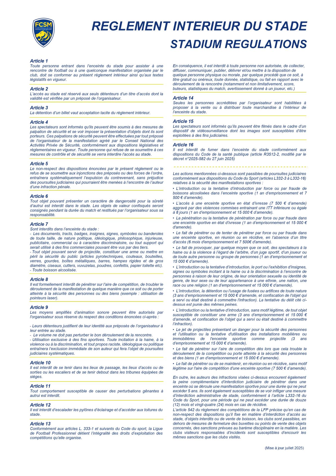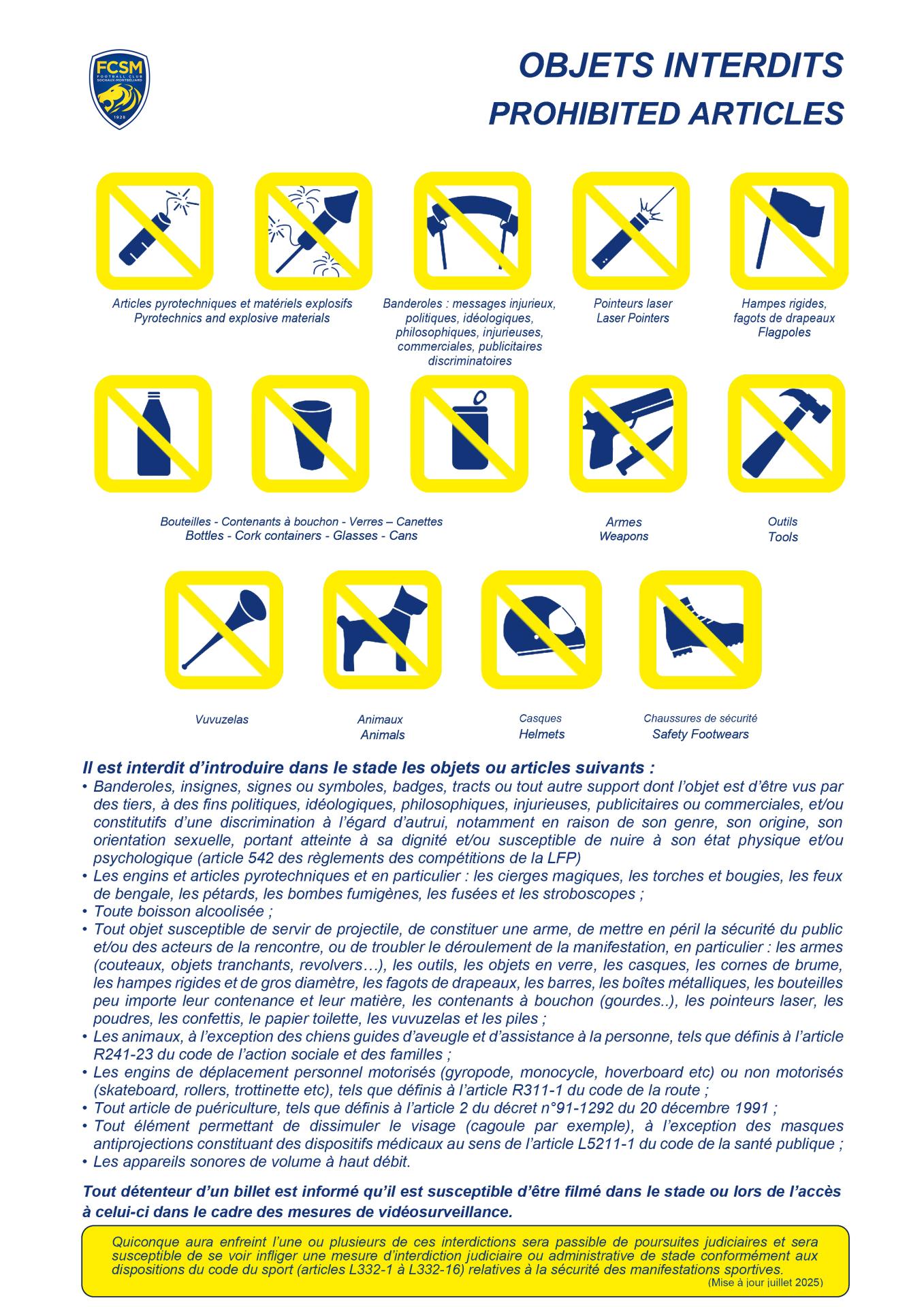 Afin d’assurer la sécurité de tous et le bon déroulement des rencontres, certains objets sont interdits au stade et un règlement est applicable à l’ensemble des supporters. Retrouvez ci-dessous les principaux éléments à connaître avant votre venue.